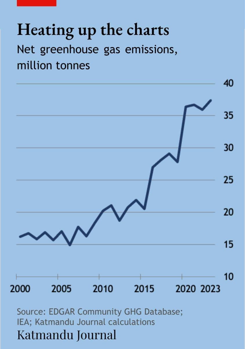 The acceleration reflects an economic aspiration. Nepal will graduate from the UN’s least-developed country status in 2026 and has set its sights on becoming a middle-income economy. Industrial output is rising and cities are expanding, as well as consumption is growing. Those are trends consistent with the early stages of economic transformation. But they are also closely associated with rising emissions, particularly in countries where policy frameworks lag behind structural change. In Nepal’s case, the transition is not yet being managed with much attention to carbon efficiency.